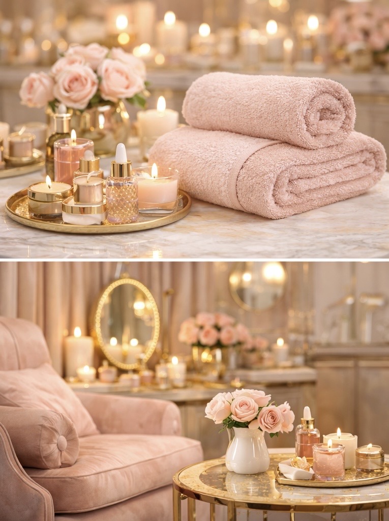 Qui, ogni dettaglio e’ pensato per coccolare corpo e mente: luci soffuse, profumi delicati, tonalita’ rosa e oro che avvolgono ogni ambiente in un’atmosfera di pura eleganza.